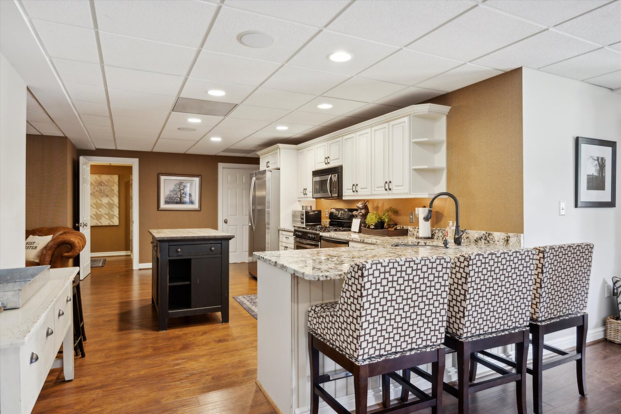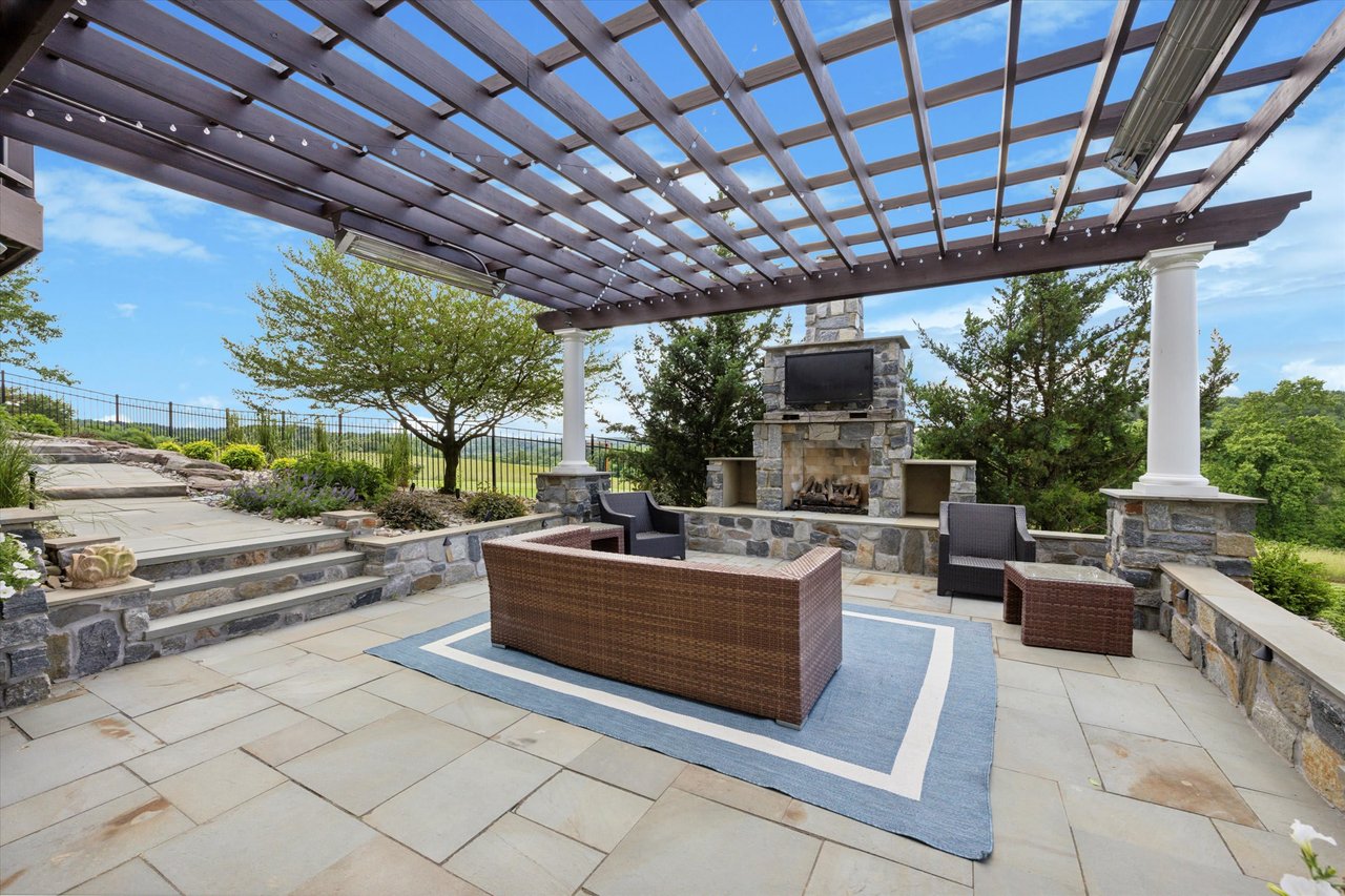 The lower level is a paradise featuring a basement family room that opens up to a stone patio with a TV and pergola. This entertainment haven includes a media room, pool table, bar, hot yoga studio, full bath, and a full second kitchen, offering everything you need for entertaining and relaxation.